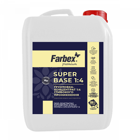 Ґрунтовка-концентрат водно-дисперсійна акрилова глибокого проникнення SuperBase 1:4 (Farbex) — це концентрований засіб для попередньої обробки мінеральних та органічних основ перед нанесенням фарб, шпаклівок, клеїв, декоративних штукатурок. Після розведення водою у співвідношенні 1:4 утворює ефективну ґрунтуючу систему з глибоким проникненням, зміцненням поверхні та покращенням адгезії.