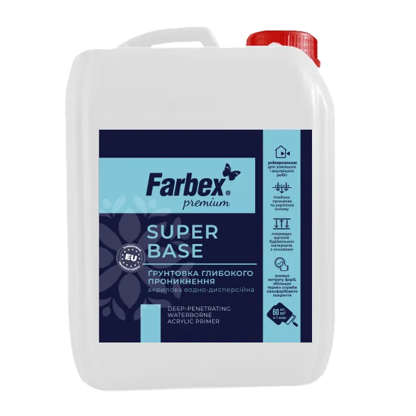 Ґрунтовка водно-дисперсійна акрилова глибокого проникнення Super Base Farbex — це готовий до використання матеріал для попередньої обробки мінеральних та органічних основ перед нанесенням фарб, шпаклівок, клеїв, декоративних штукатурок. Забезпечує глибоке проникнення, зміцнення поверхні та покращення адгезії.