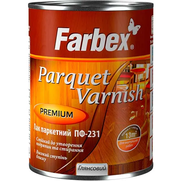 Лак паркетний ПФ‑231 Farbex — алкідний декоративно‑захисний лак для деревини та підлогових покриттів, що утворює міцну блискучу плівку з підвищеною зносостійкістю; рекомендований для меблів, паркету та підлог у житлових і комерційних приміщеннях; доступний у фасовках 0,75; 2,5; 45 л.