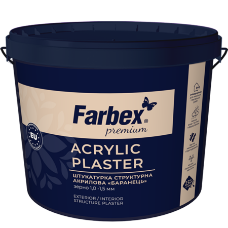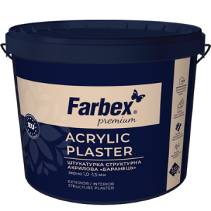 Штукатурка структурна акрилова «Баранець» Farbex — готова до застосування декоративна штукатурка для зовнішніх і внутрішніх робіт, що формує рельєфне покриття з характерною фактурою «баранця». Акрилова основа забезпечує еластичність, стійкість до вологи, УФ-випромінювання та механічного зносу.