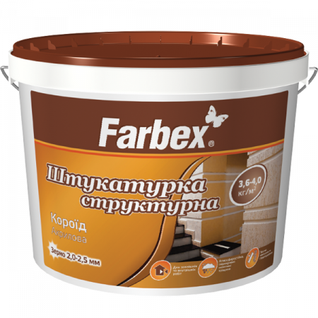 Штукатурка структурна акрилова «Короїд» Farbex — готова до застосування декоративна штукатурка для зовнішніх і внутрішніх робіт, що формує характерну борознисту фактуру типу «короїд». Завдяки акриловій основі має високу еластичність, стійкість до атмосферних впливів і механічного зносу.